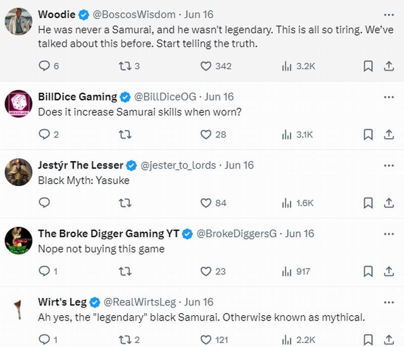 在评论区有人表示:“戴上它能增加武士技能吗?”“《黑神话:弥助》”“传说中的黑武士,或者说是神话”“他从未成为真正的武士,也没有传说般的地位。”“弥助既不是传奇也不是武士。《对马岛之鬼》更好玩,我也会等《黑神话》上线。”“IGN就是一坨翔。”
