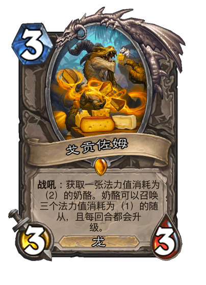战吼:获取一张法力值消耗为(2)的奶酪。奶酪可以召唤三个法力值消耗为(1)的随从,且每回合都会升级。
