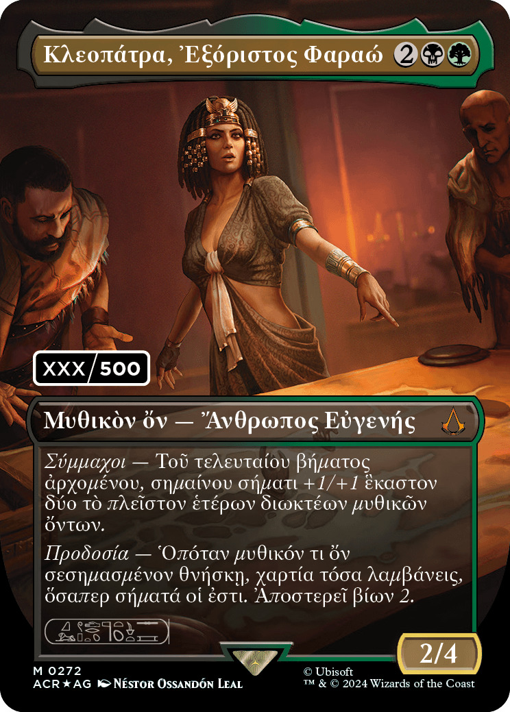 聚珍补充包里有4种限量编号复合虹彩闪牌,每一种都绘有Assassin's Creed游戏中著名的历史人物。这些限量编号牌都以这些角色所说的语言印制,请看意大利语的莱昂纳多·达·芬奇和希腊语的克利奥帕特拉(背景叙述里是象形文字的克利奥帕特拉(犀牛注:克里奥帕特拉的王名茧))。