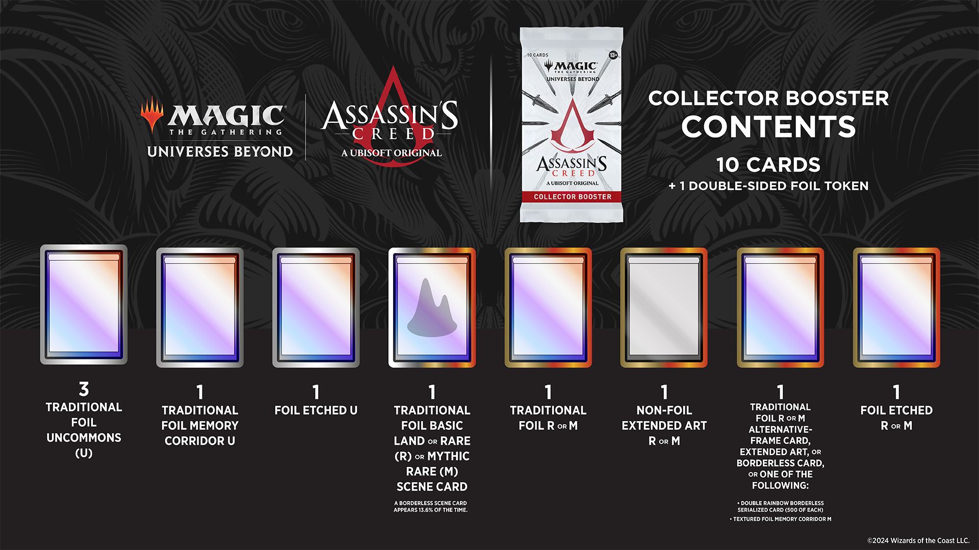 Magic: The Gathering – Assassin's Creed(ACR)补充包系列内含54张非普通牌、37张稀有牌(包含5张稀有双色地)以及14张秘稀牌,此外还有10张全图基本地。