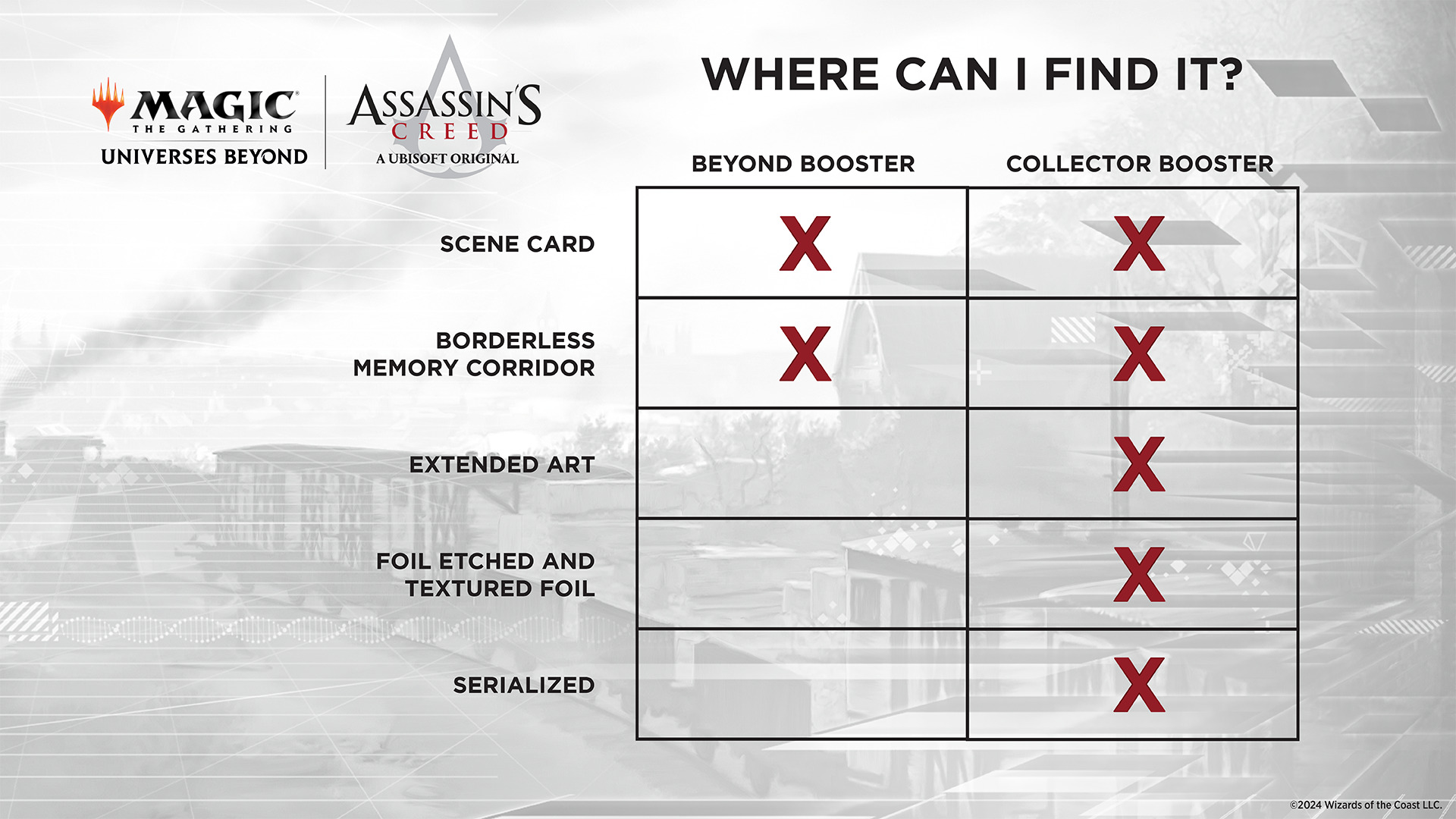 刺客们,准备行动——Magic: The Gathering – Assassin's Creed于2024年7月5日上市,现在你就可以预定,请去你本地的游戏店和其他出售万智牌产品的地方。