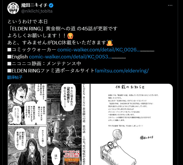 《艾尔登法环:黄金树幽影》即将在6月21日正式推出,各路玩家都在摩拳擦掌准备送死,没想到其中也包括一位漫画家,《艾尔登法环》衍生漫画《黄金树之路》的作者飛田ニキイチ日前宣布7月19日临时停载一期,原因居然是和大家一起享受《艾尔登法环:黄金树幽影》。