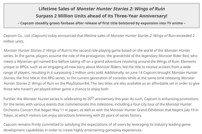 6月19日,卡普空宣布《怪物猎人物语2:破灭之翼》累计销量已突破200万,该作最初于2021年7月9日登陆Switch和Steam,2024年6月14日登陆了PS4。此外,在2021年7月20日,官方曾宣布该作销量已达100万。