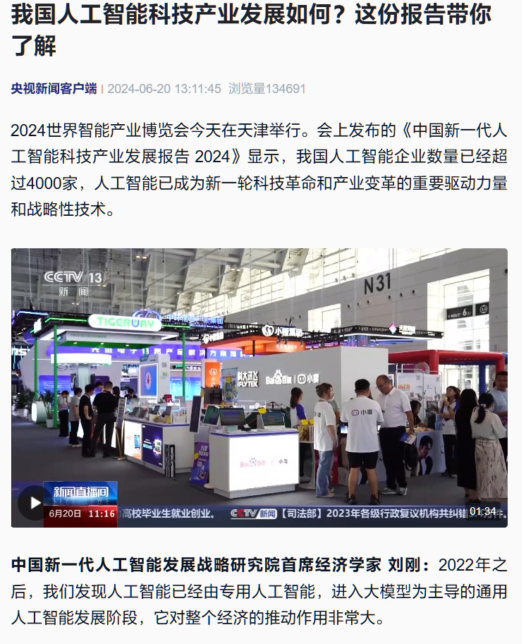 今日(6月20日)消息,IT之家从央视新闻获悉,2024世界智能产业博览会今天在天津举行,《中国新一代人工智能科技产业发展报告 2024》发布。