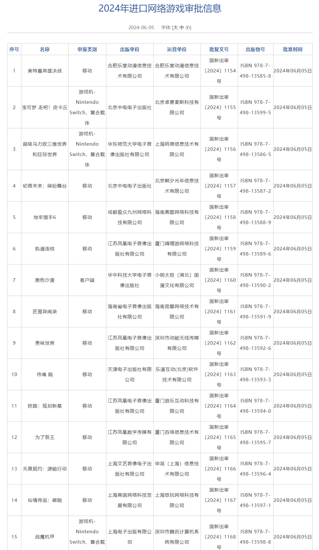 6月5日,国家新闻出版署公布了2024年6月进口网络游戏版号信息,共15款游戏获得版号,包含主机、移动和客户端,《宝可梦 走吧!皮卡丘》、《初音未来:缤纷舞台》、《黑色沙漠》等游戏获得版号。