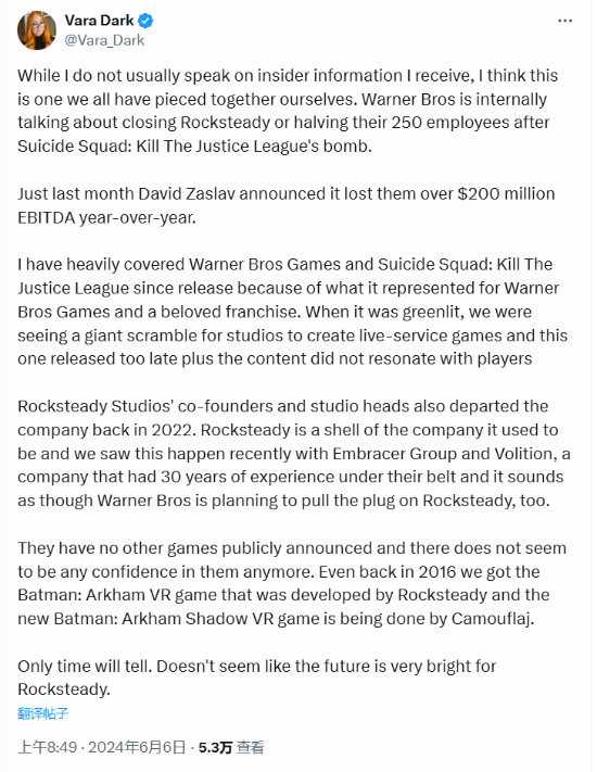 鉴于这些情况,据传华纳兄弟正在考虑关闭开发这款游戏的Rocksteady工作室。