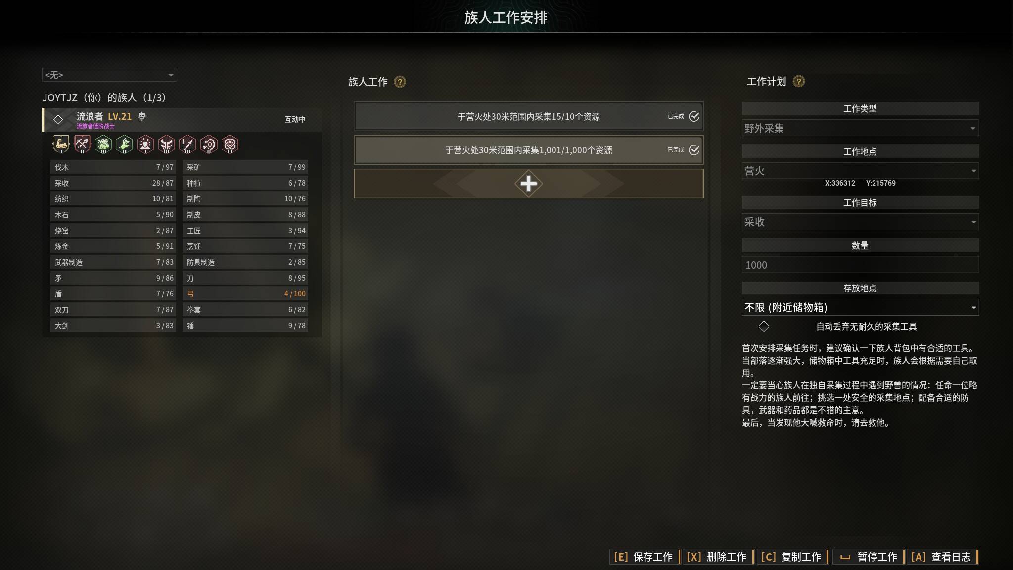 这个设计如果你玩过帕鲁的话那一定不会陌生,但本作的野人系统更加精细,比如采集工作来说,从工作地点、工作路径、资源采集数量到最后的存放地点都可以由玩家设置,对于资源种类丰富的本作来说可以实现更多精细化的工作。此外每一个野人跟玩家都是一样的,都有自己的背包,一定程度上也可以当作移动背包来使用,不过缺点依旧不乏,游戏中ai路径会时常出现问题,比如房屋在没有安装台阶之前,安排任务后无法识别路径会卡住,但是却不会给你任何提示,在后续野人多的情况下如果没注意就会降低很多效率。
