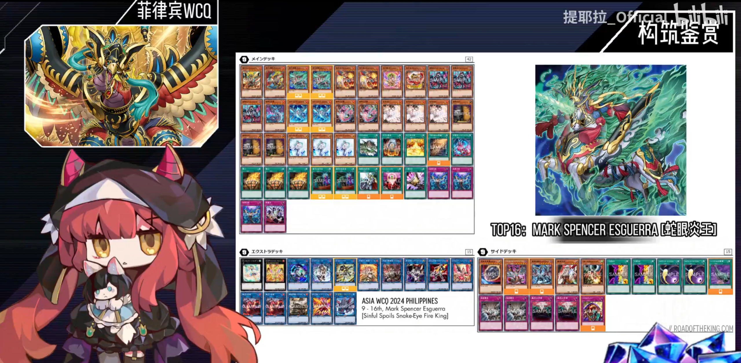 接着是十六强的炎王蛇眼选手,不投入刻魔轴的情况下炎王的主轴数量大大提高了并且不用担心被一波耗完所有的炎王资源,比起隔壁香港站只有六张炎王的构筑这位才是实打实的炎王。炎王妃作为初动点虽然不如蛇眼艾克赛尔来的优秀并且强制要求二卡启动,但依旧可以打完一套标准炎王展开,在罪宝蛇眼轴以及炎王麒麟收到禁卡表影响的情况下将空余卡位提供给炎王妃刚好合适。
