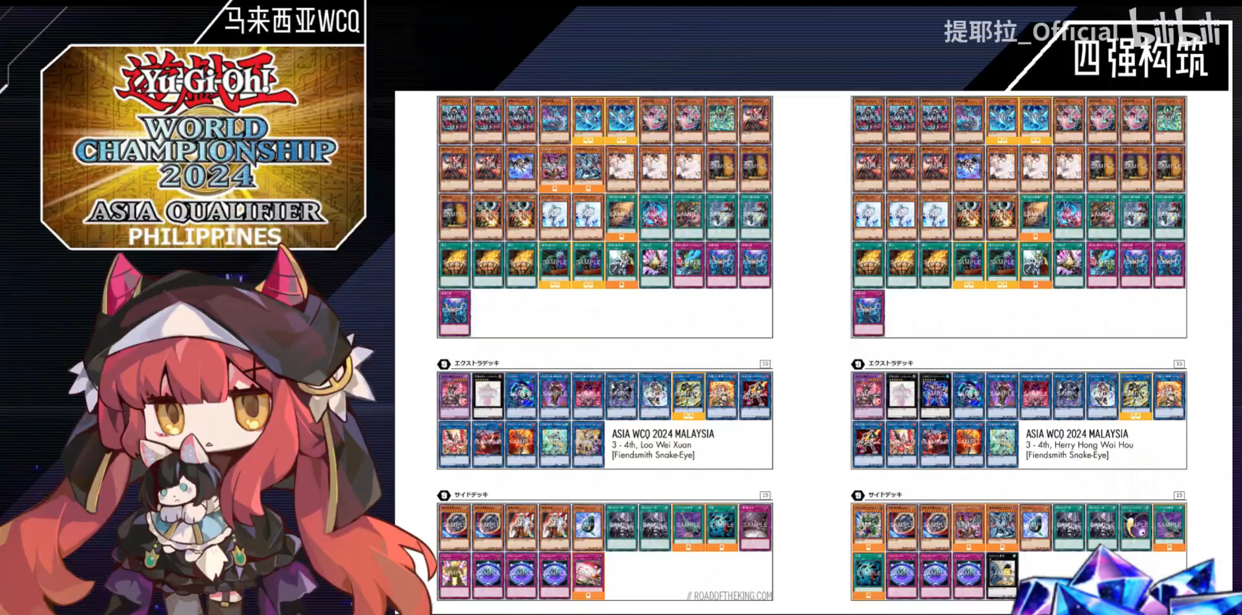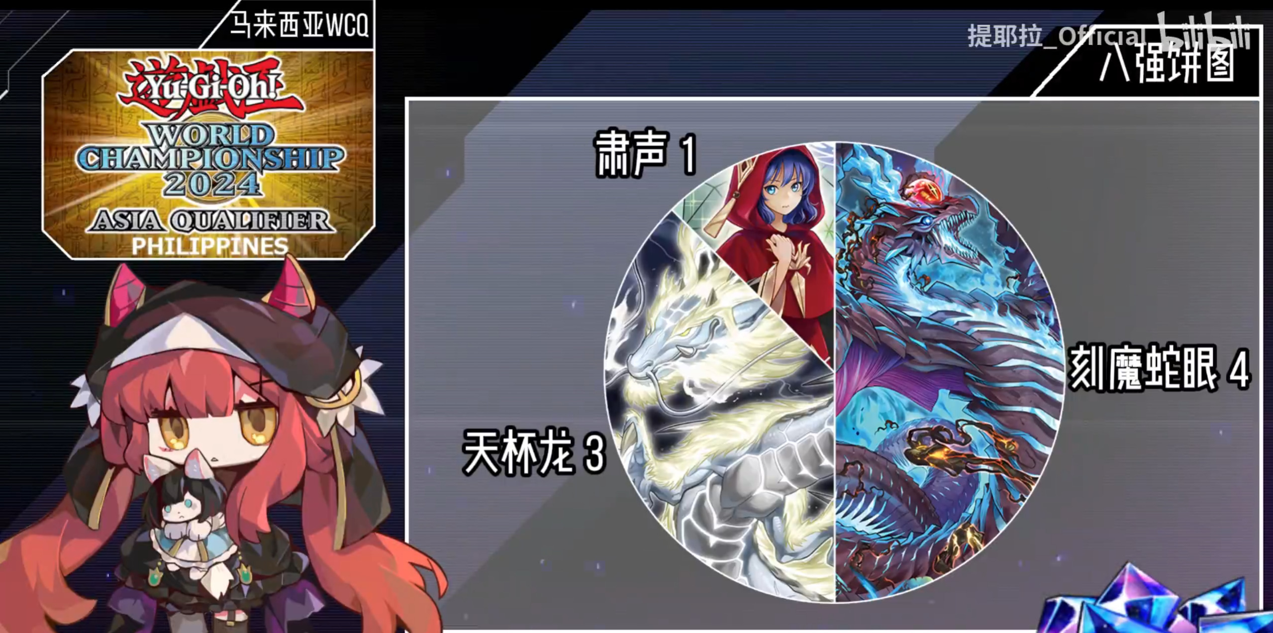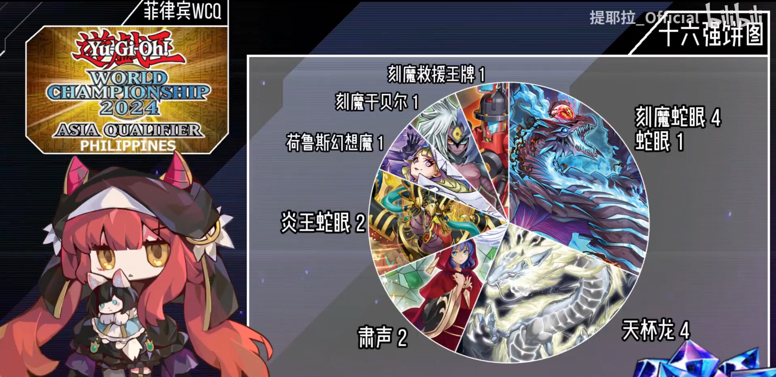 最后一场大赛,来自于六月一日的马来西亚wcq,有192位选手参加,本场大赛的前四强全部为刻魔蛇眼,剩余的四位出轮卡组为三位天杯加一位肃声。