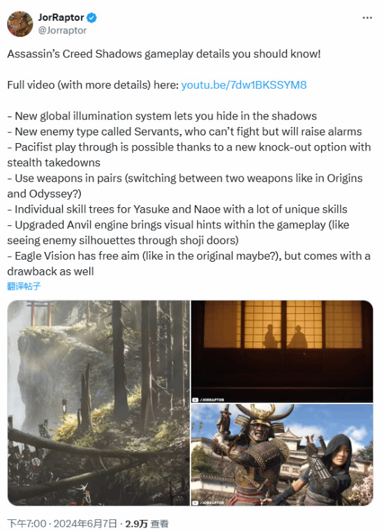 与此同时,还有推主Jorraptor分享了一些关于《刺客信条:影》的游戏细节: