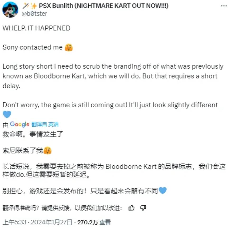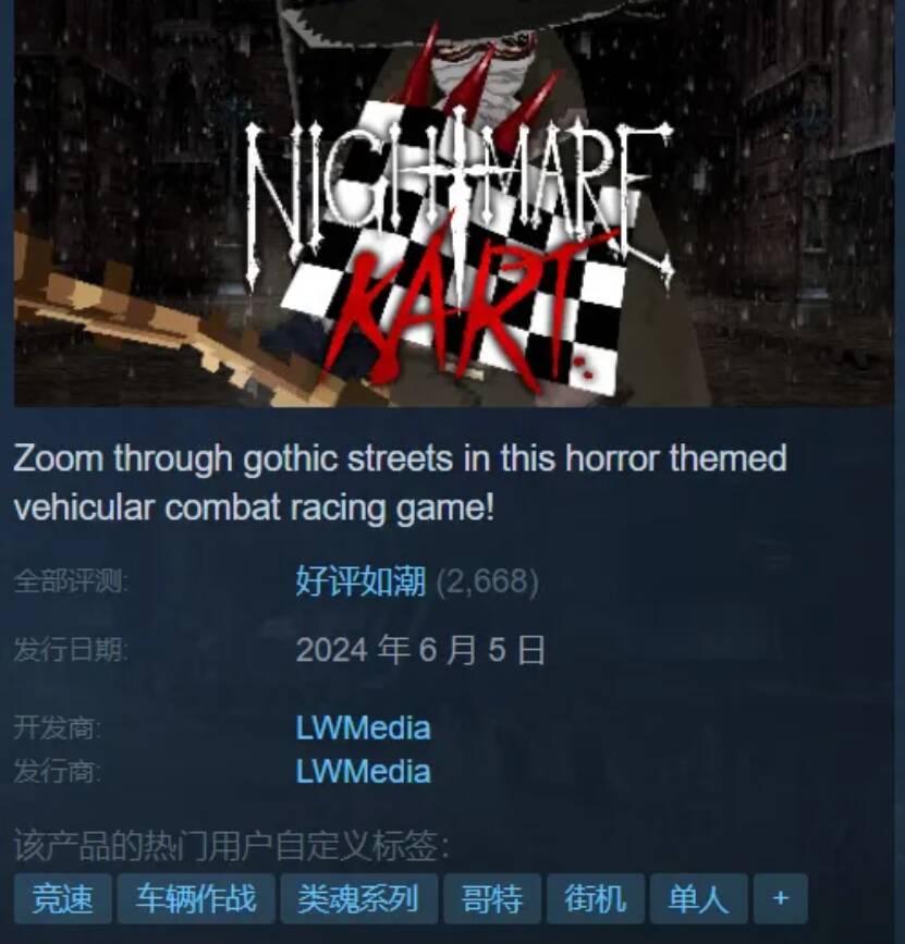 但索尼施加了版权压力,原本《血源卡丁车》定于今年1月份发布,游戏作者表示,接到了来自索尼的版权警告,于是将游戏的名字改为了《噩梦卡丁车》,你可以在steam搜索“Nightmare Kart”找到这款游戏。