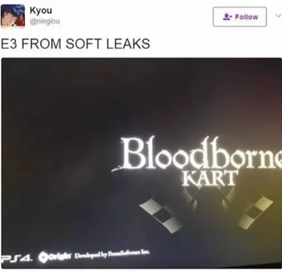 2017年的E3游戏展期间,玩家们希望《血源诅咒》能够推出pc移植版,有用户在网上表示,From Software将在E3推出《血源卡丁车》这款游戏。粉丝们其实能明显判断出,这其实是个玩梗性质的谣言。