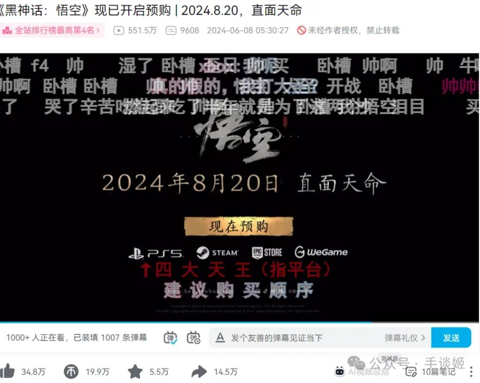 2024年6月8日,《黑神话:悟空》官方发布最新宣传视频,宣布游戏已开启预购,并将于2024年8月20日上线。