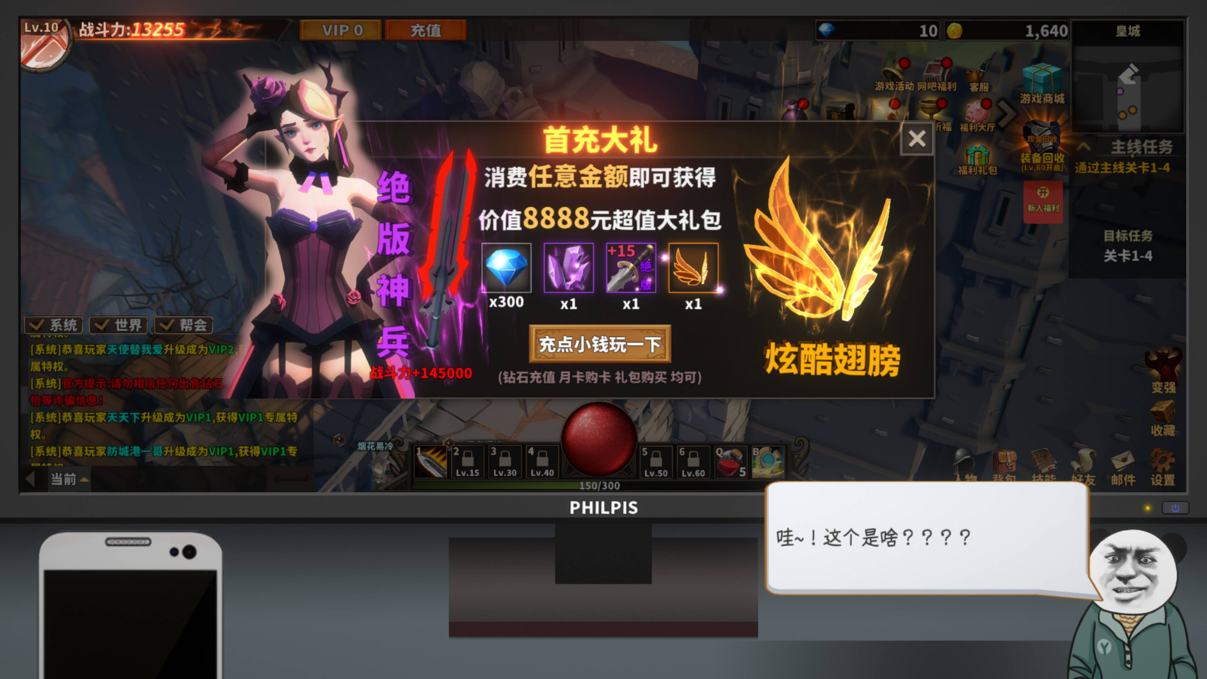 在传统国产网游中什么是最强战斗力!当然是氪金!氪金!还是氪金!氪金可以极大程度提升你的游戏体验。在《中国式网游》中你可以随意充值648,感受“一刀999”的极致快感。在野外、皇城、竞技场中,你可以轻松击败那些不充钱的玩家,体验充钱带来的无与伦比的优越感。游戏内嵌的网游系统还原了传统国产网游的玩法和套路,包括装备强化、宝石翅膀、技能升级、宠物元神等多种元素,让人仿佛置身于一个真实的网游世界。这种设定不仅真实地反映了某些网游的现状,也在游戏中给玩家带来了极大的满足感。