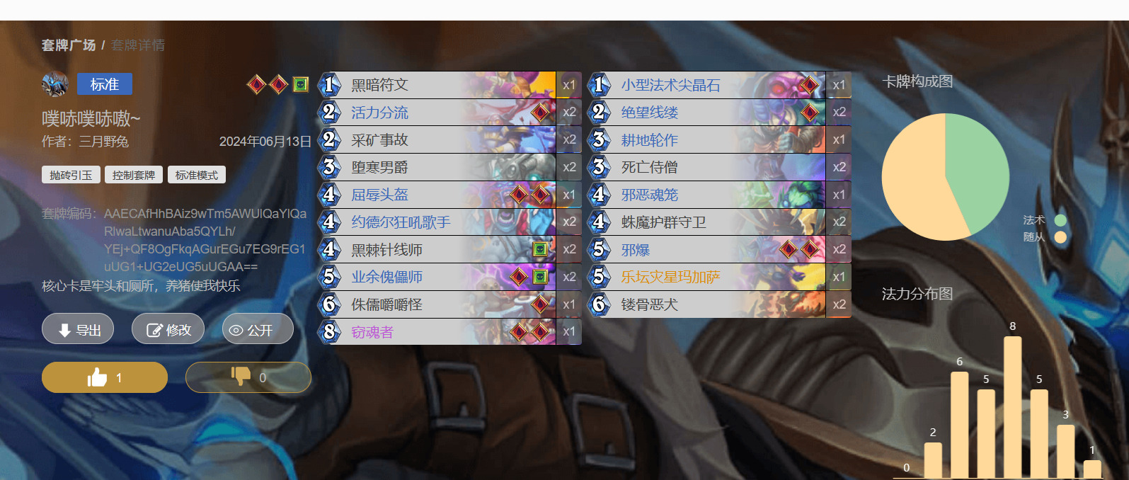 笔者用这套牌在亚服13000名的超级分段打出了5连胜打的好成绩,被扑哧扑哧的对象分别是:1个宇宙牧,1个挖宝贼,1个防战,1个龙德,1个超生猎。