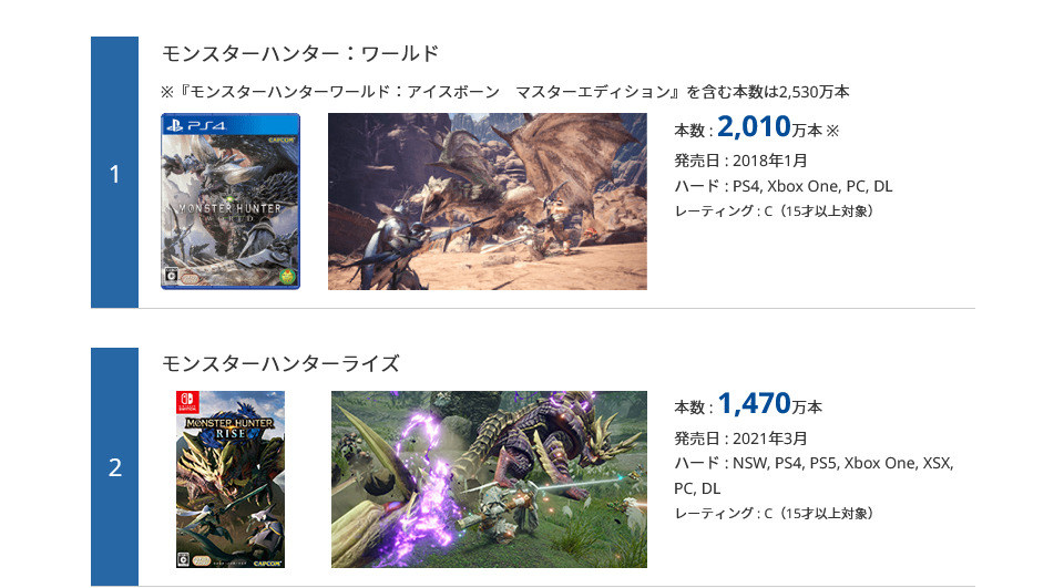 也许传统的《怪物猎人》粉丝或是《X》系列粉丝对《世界》在某些方面上并不满意,但作为向现代化 3A 靠齐并将系列拓宽到更多玩家视线中的作品,德田总监的方向毫无疑问获得了成功,因为《怪物猎人:世界》是目前卡普空白金榜单销量排名第一的游戏,全球销量至今已经达到了2010 万份,超过第二名的《怪物猎人:崛起》 540 万份。