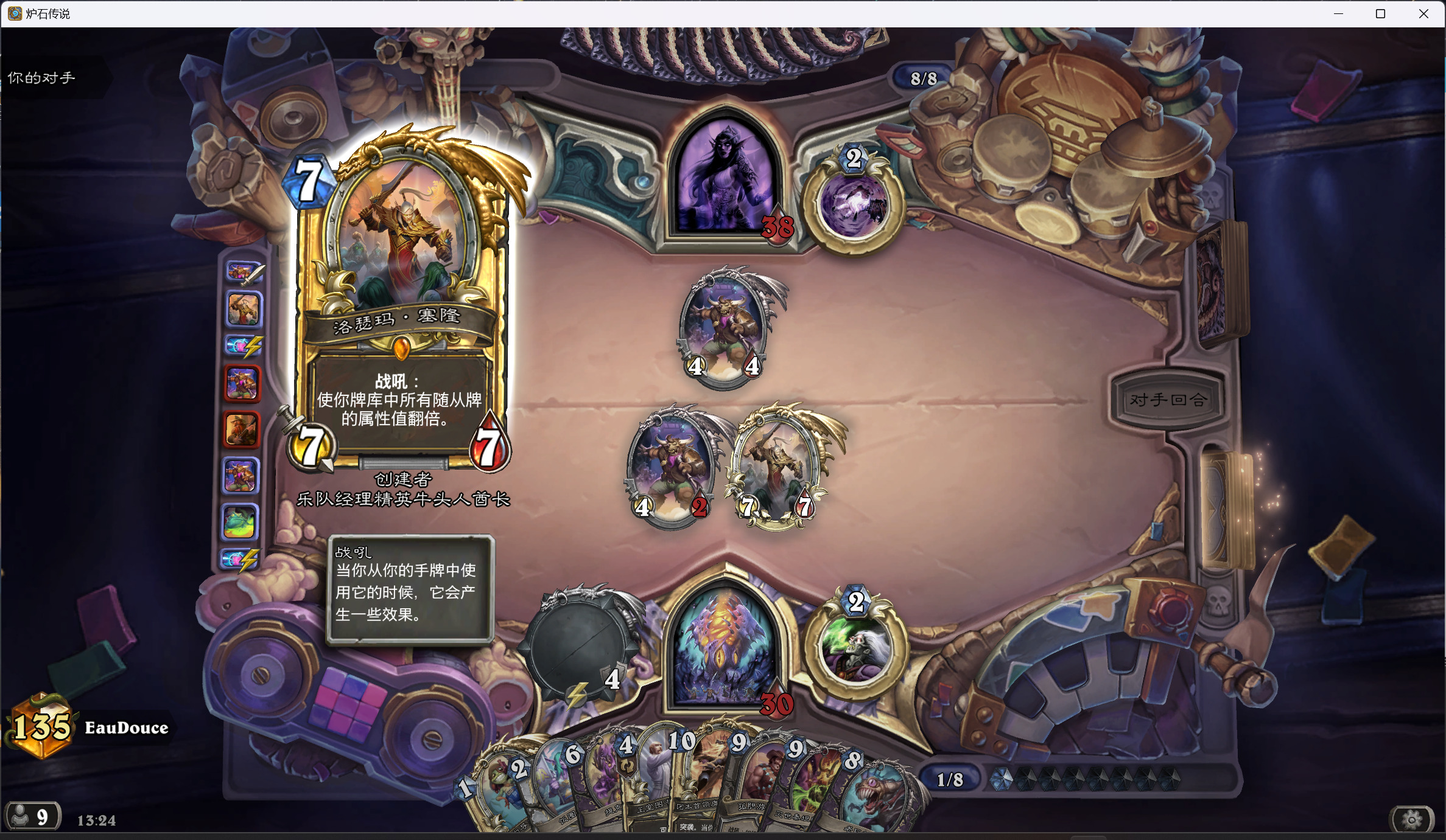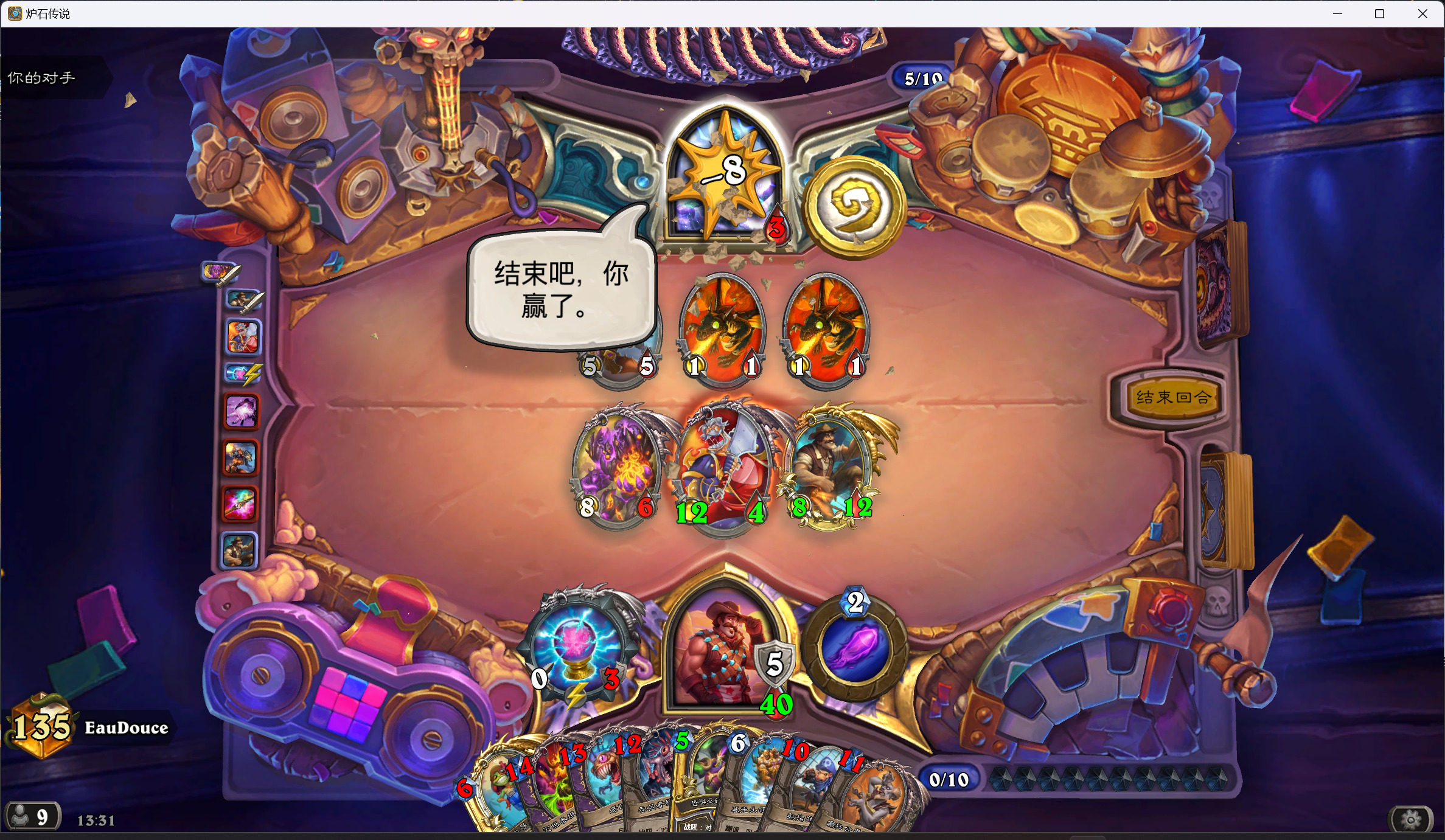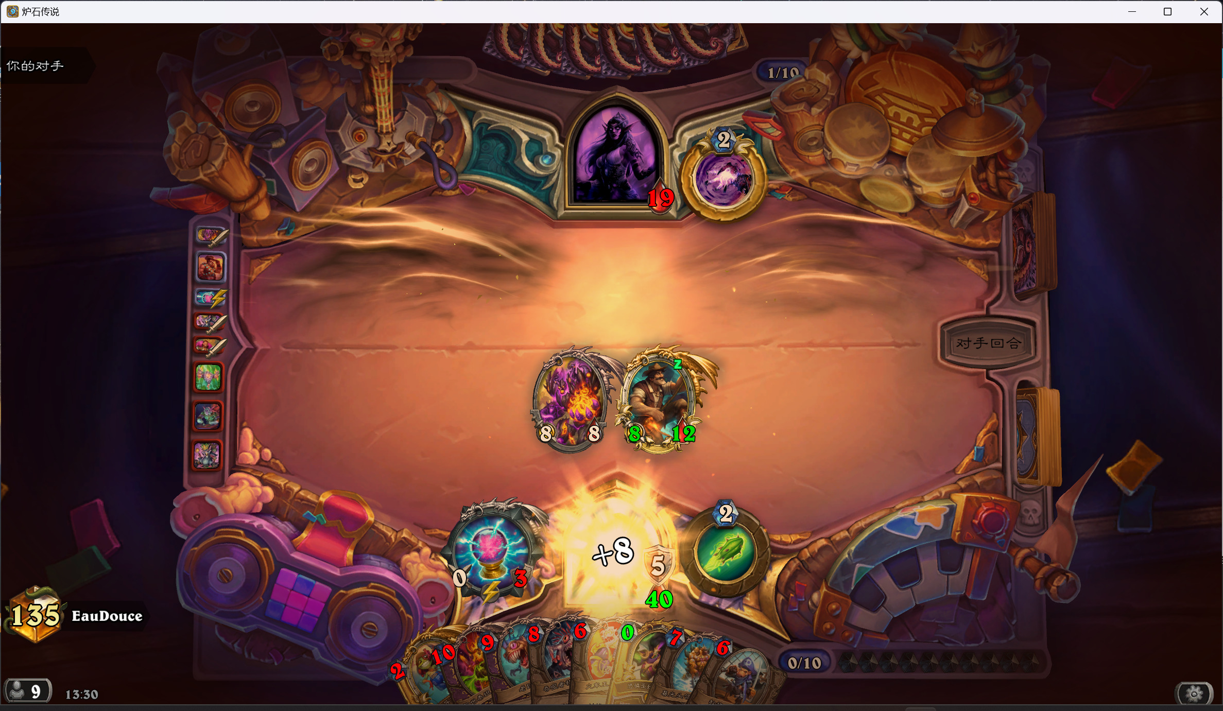 对面ams移除了奇利亚斯,我们1088龙巢之母轻松解掉。之后对手拍下新拉兹+吞噬解决龙巢之母的小怪,但我拍下了雷诺,以及新出的马林,拿到了0费的大号雷诺。此时对面明显解牌不够了