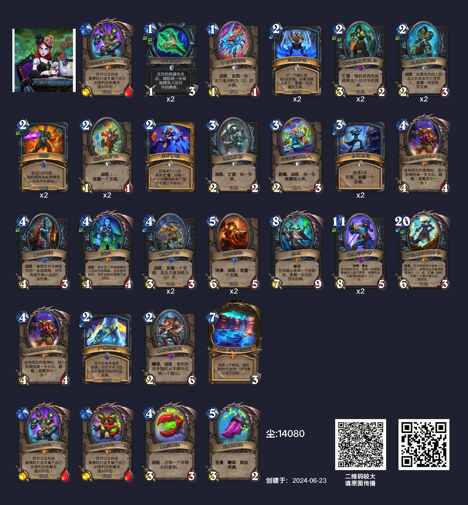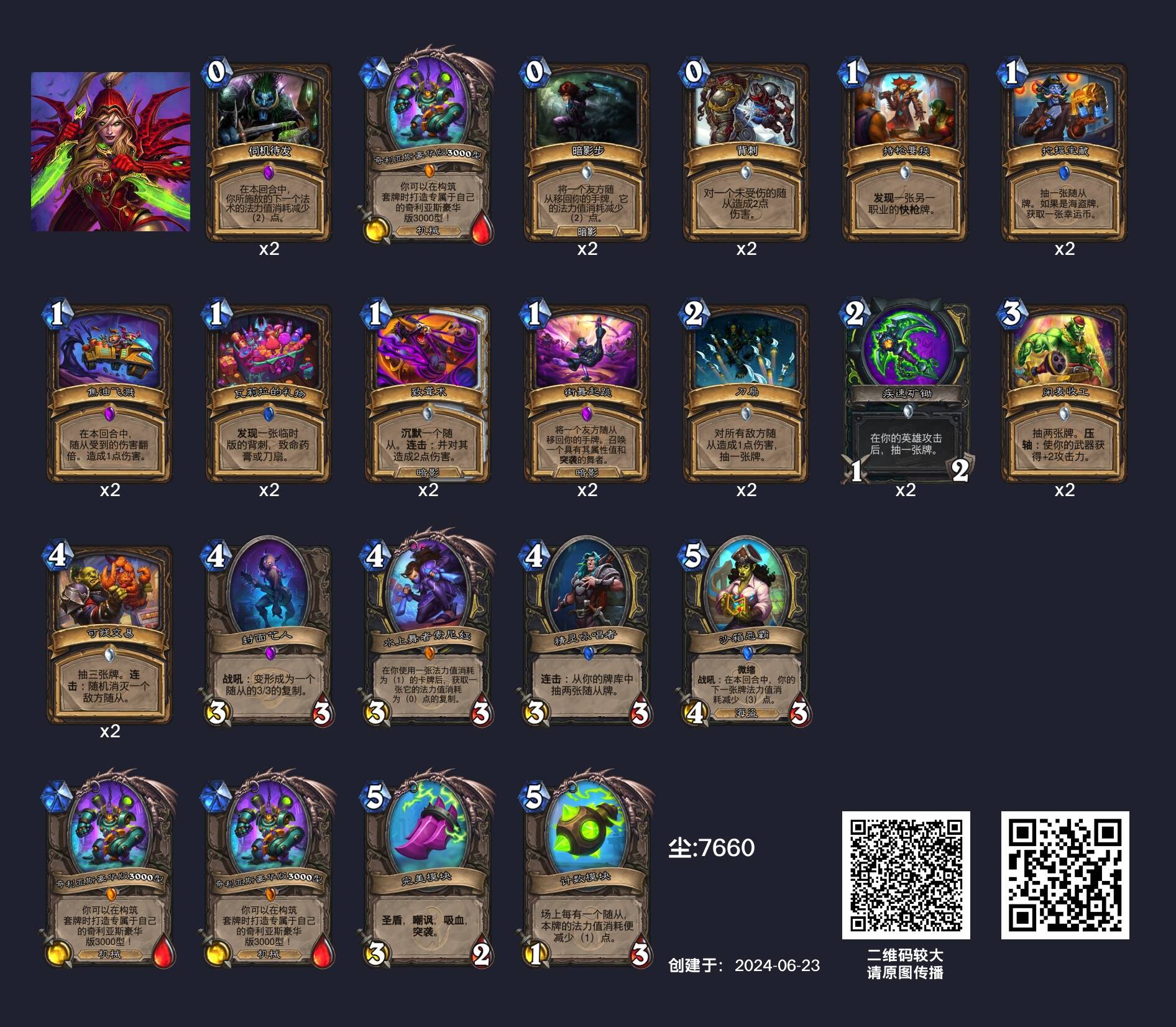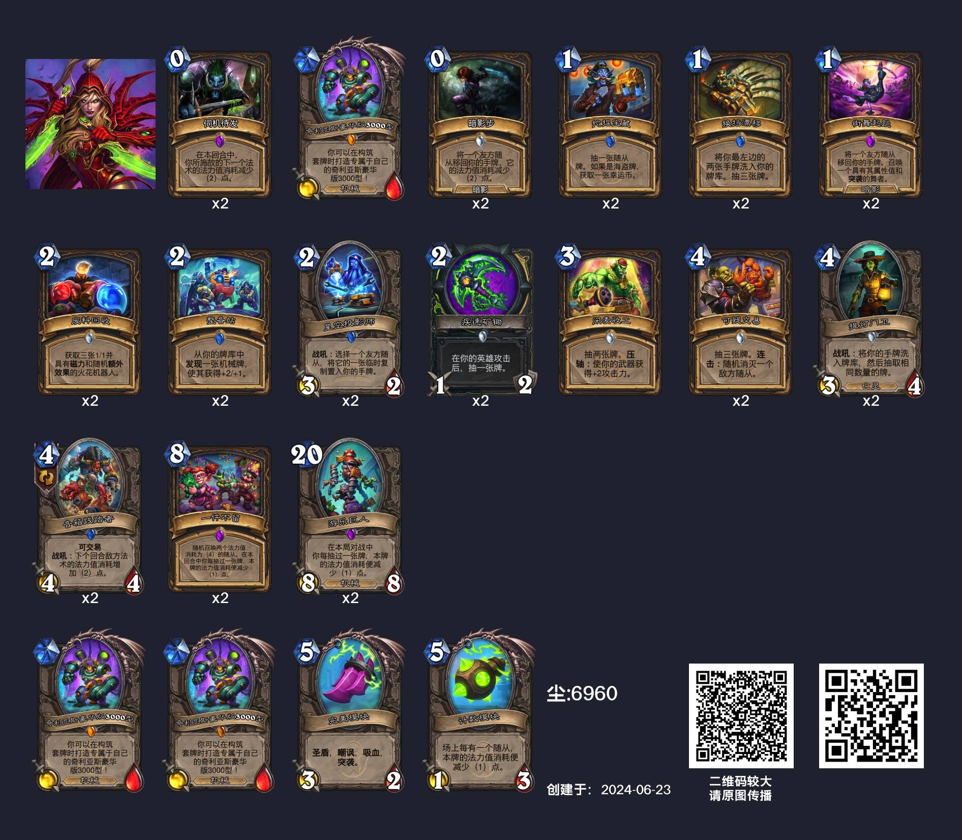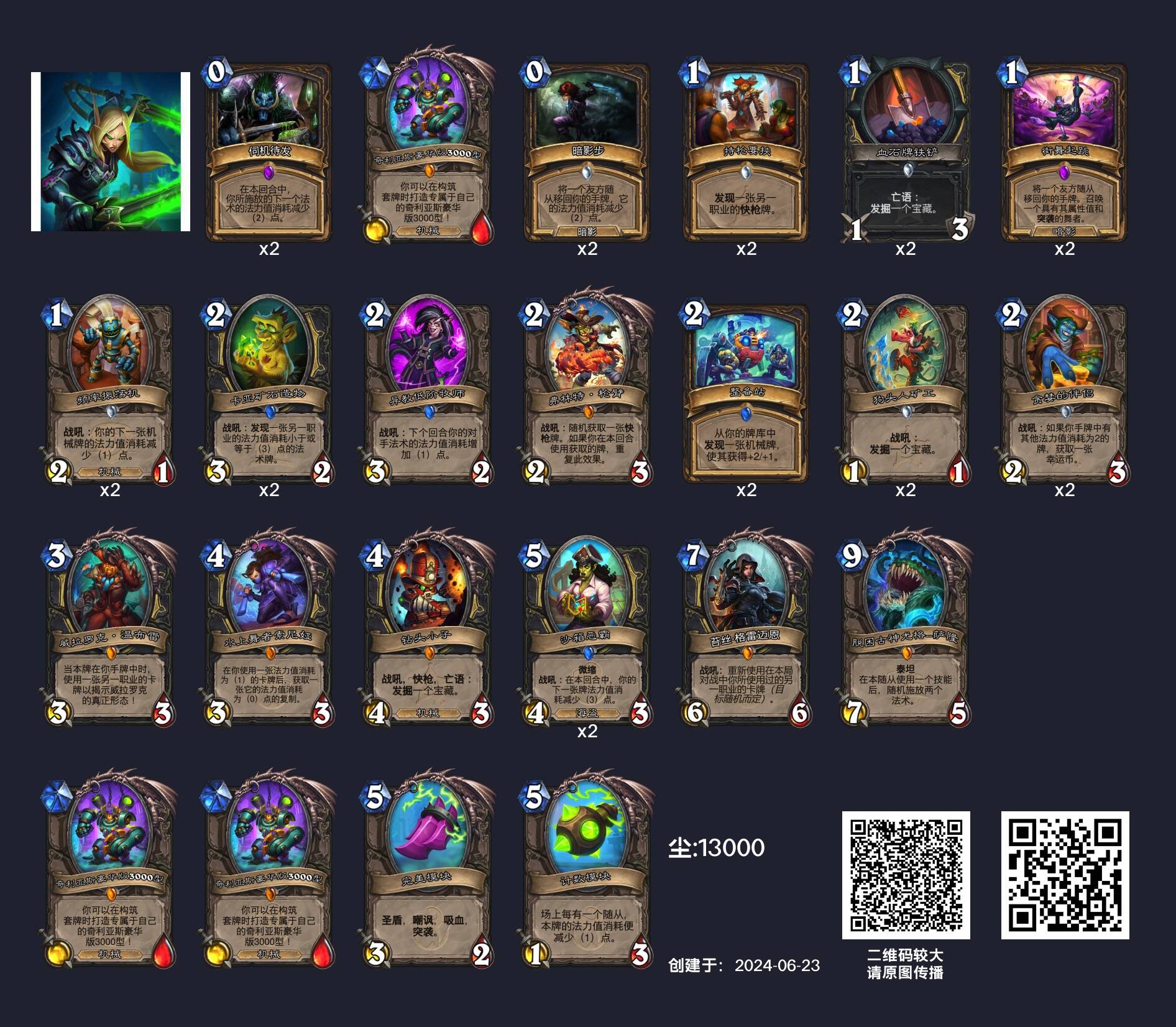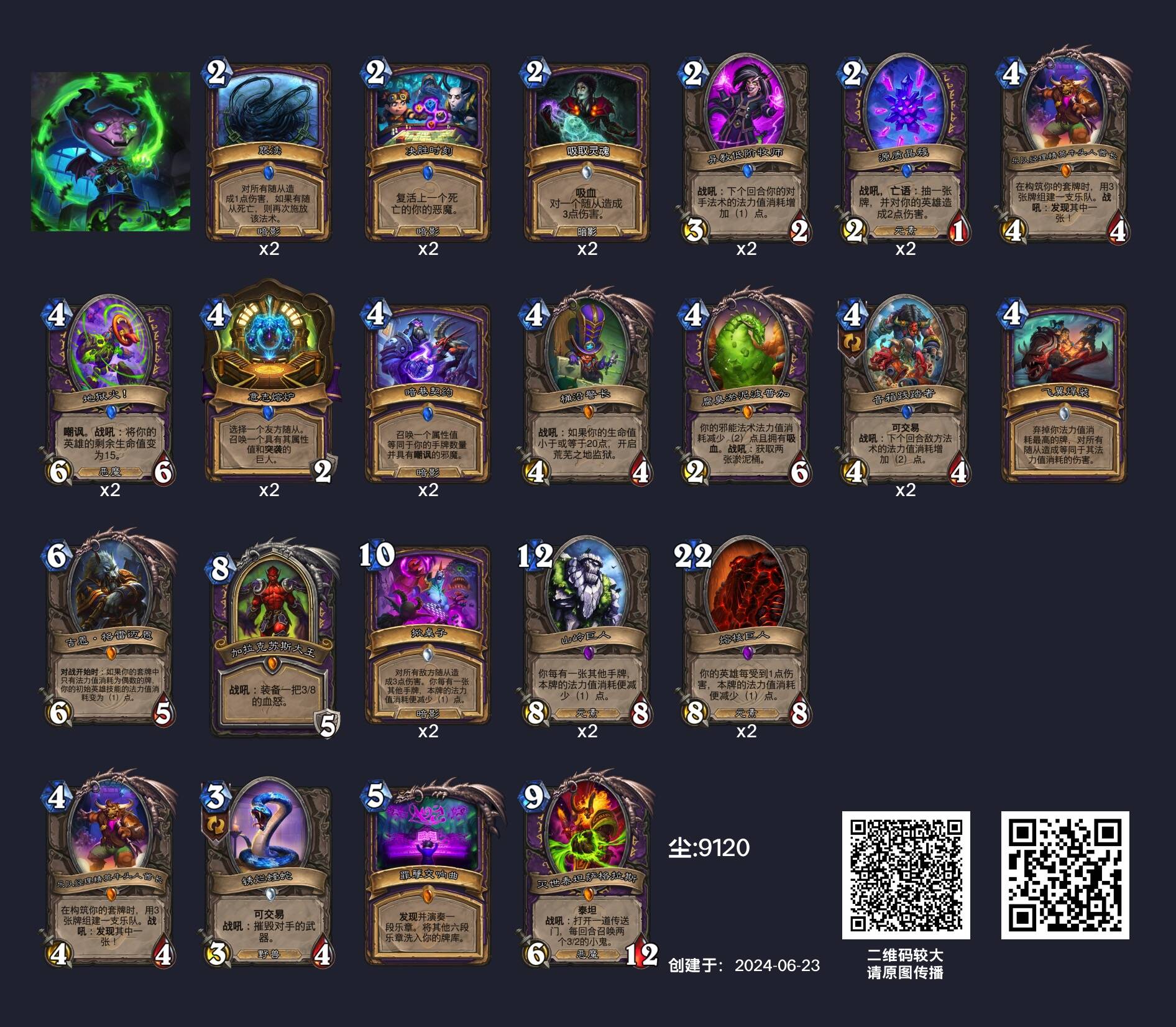 病 DK 在当前环境中的表现被低估了,疫病对于过牌能力不错且血线一般不算健康的疲劳术和长盘能力拔群的宇宙战都有不错的克制效果。在构筑上,我非常推荐大家携带泼漆彩鳍鱼人,无所谓是什么体系。按照最早携带这张卡的嘘月(也是他把 DK 推荐给了大狼普雷)的说法,它不仅可以处理自残术、巨人贼的超展开,还可以检索到破地钻机和矿坑老板雷斯卡,在病 DK 中还可以抽到链缚守护者,都是能打出不错进攻的单卡。
