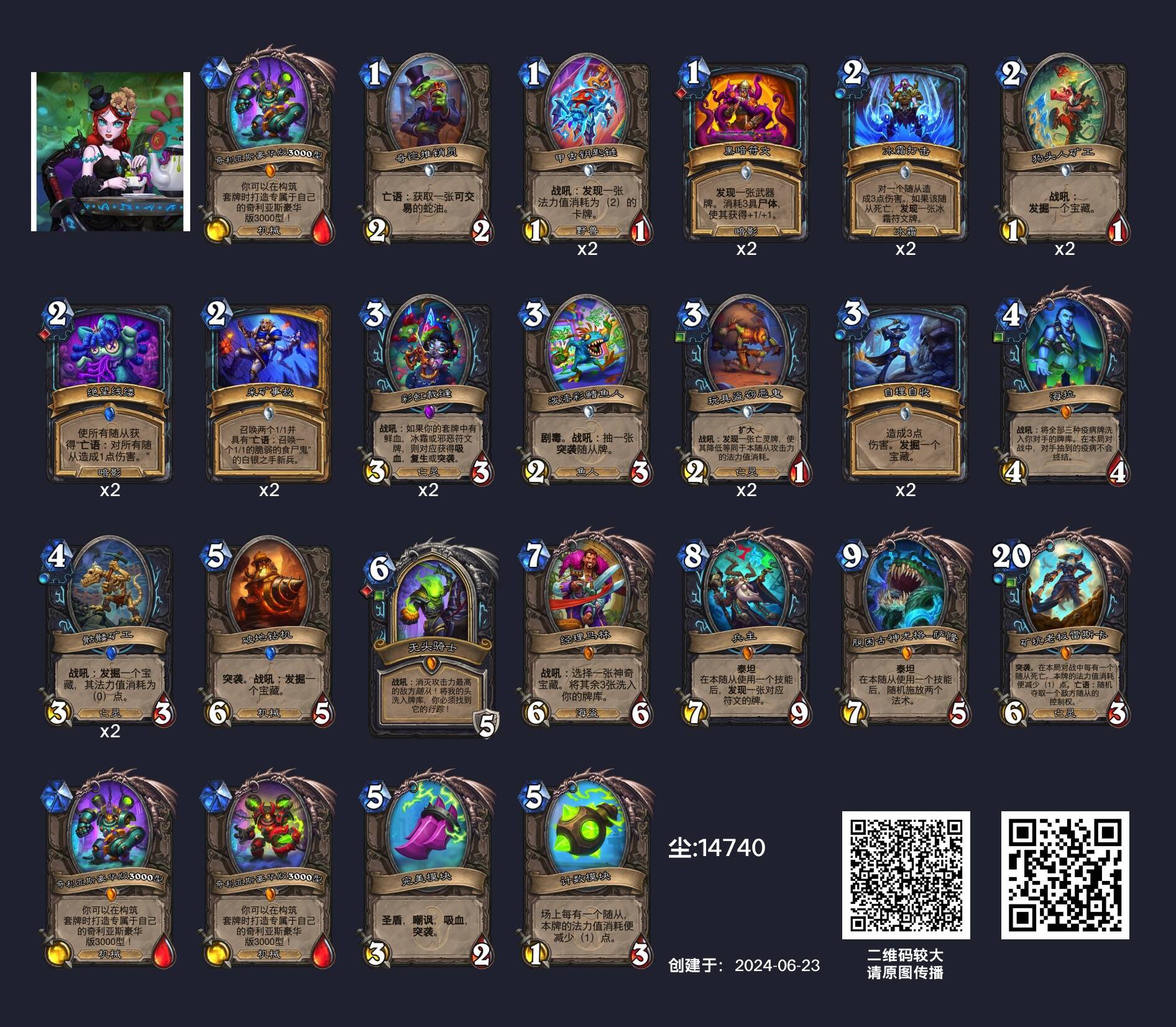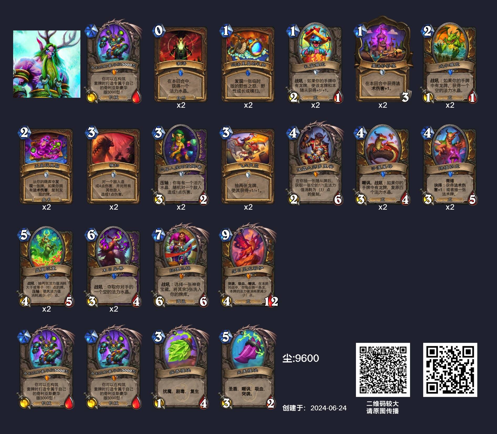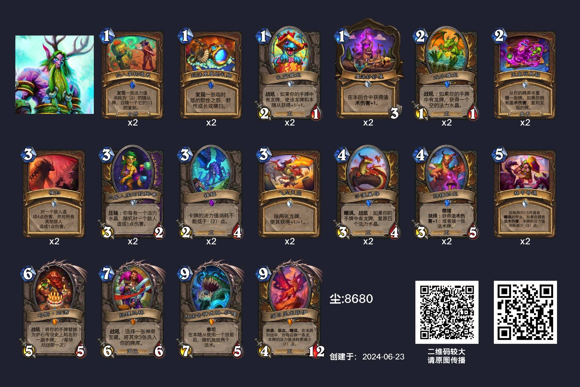 小版本前昙花一现的法强龙德再加入新卡并调整构筑之后卷土重来,在保留了法强加持下的超高伤害以及龙体系带来的跳费和小展开能力的基础之上,现在版本的法强龙德抛弃了出伤较慢且有一点亏节奏的强化技能体系。全新加入的傀儡大师多里安-盛夏花童滤抽体系可以抽到末日枭兽或者经理马林,无论抽到哪张牌,卡组的上限都能得到极大的提升:如果在前中期抽到末日枭兽可以打出非常夸张的费用压制,十费打四费的惨案比比皆是;如果抽到经理马林则可以利用双倍的宝藏打出节奏压制。在实际操作中,这套卡组对上无法稳定回血的挖掘贼、疲劳术和宇宙战都比较好打,这也可以看做是它的立身之本。当然,不可否认的是,这套卡组比较依赖牌序,但是考虑到它夸张的上限这也不是不能接受。
