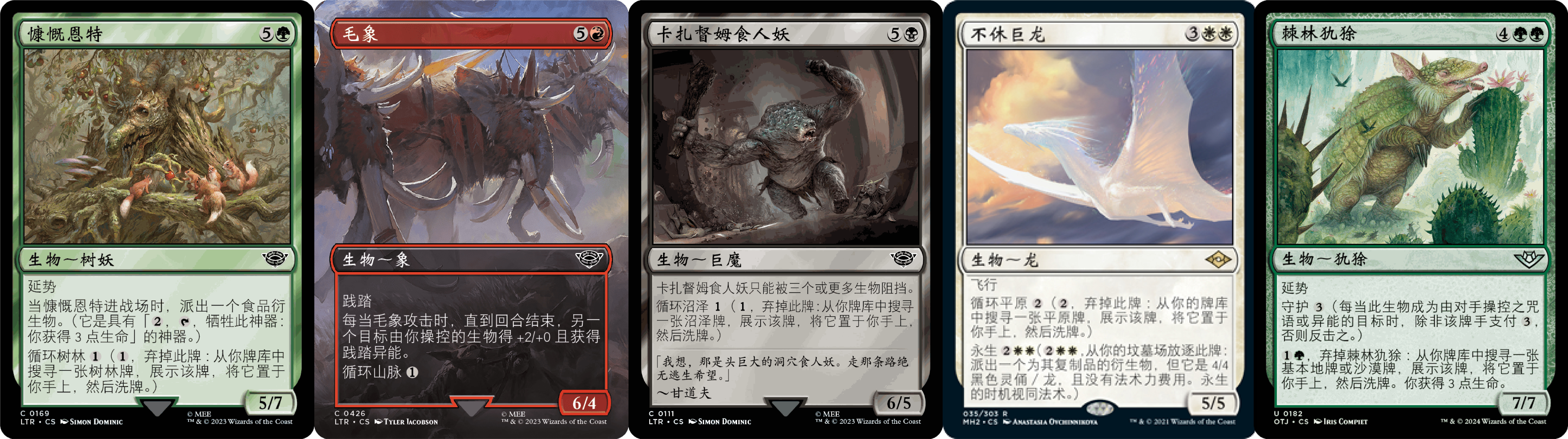 前文提到的Ramp核心生物外,调色也很重要,其中【不休巨龙】和【棘林犰狳】还提供额外价值,LoTR的三只1费循环最效率(循环海岛作用较低:劫掠海齿兽和潮浪惧兽,克洛萨长牙野猪虽然能赚一,但并不值得一张卡位)