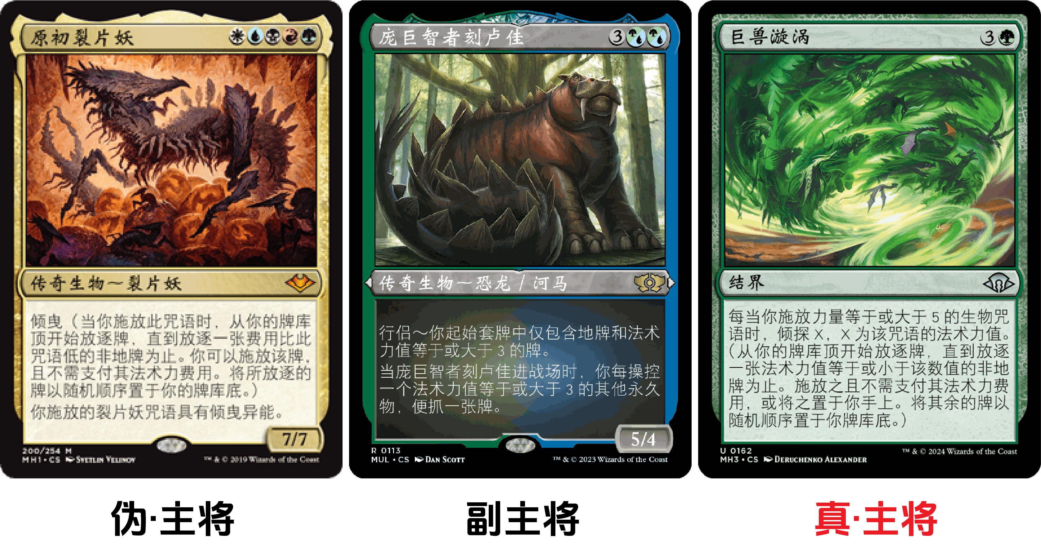 为了让“假·主将”【原初裂片妖】稳定翻出“真·主将”【巨兽漩涡】,除power>4的约束条件外,套牌中也不能出现其他MV<5的咒语,即要求MV>4,也正好符合【庞巨智者刻卢佳】行侣条件。那么围绕【原初裂片妖】和【巨兽漩涡】的特化构筑约束条件也就一目了然了: