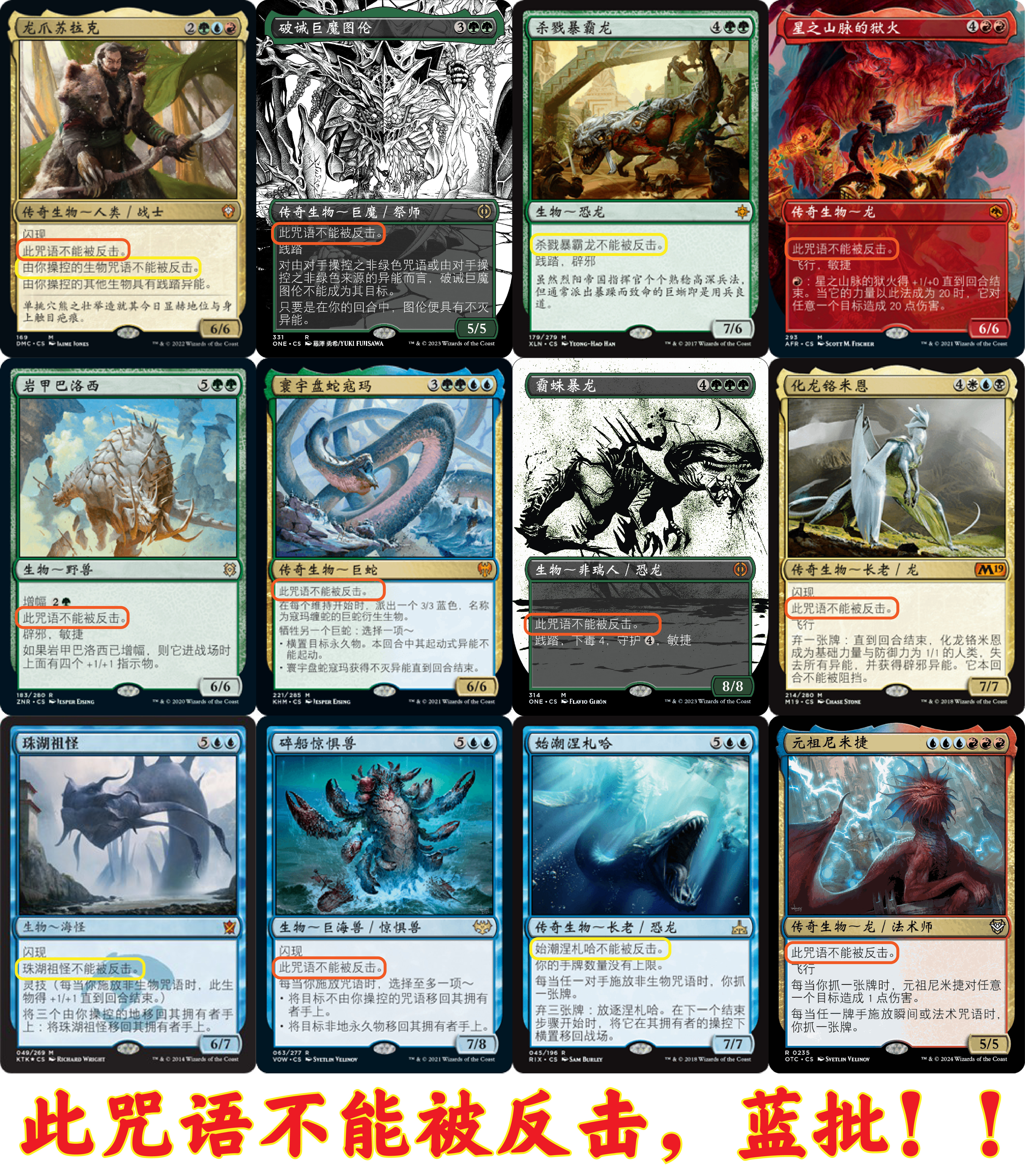 作为慢速套牌,蓝批可谓是一生之敌。为了能与之有一战之力,变身地是一种策略。以上列出环境全部(符合特化条件的)12只“不能被反击”生物,我愿称之为“蓝批十二爹”,其中【龙爪苏拉克】是大爹中的战斗爹,【元祖尼米捷】颜色过于封闭最逊。一般来说套牌有40+卡位留给生物,除8核心大厉害+8加速调色+8互动,完全足够留12卡位给这些大爹。