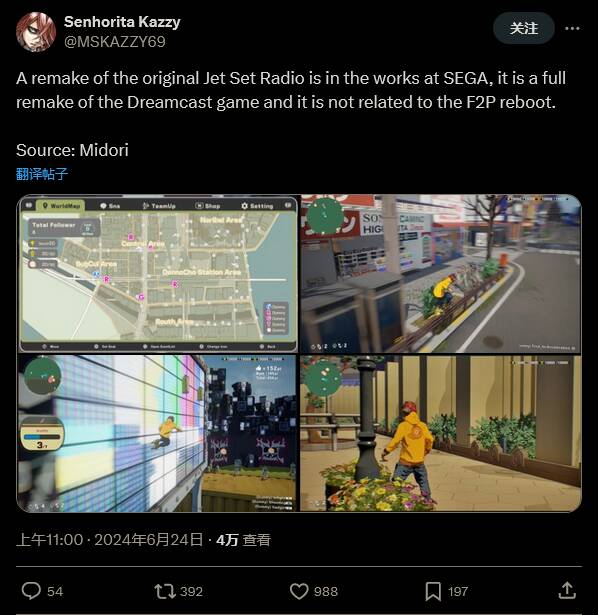 此前已经有消息称,世嘉正在制作一款 2000 年经典动作游戏《街头涂鸦》的重制版。目前游戏的截图已经在网上泄露。