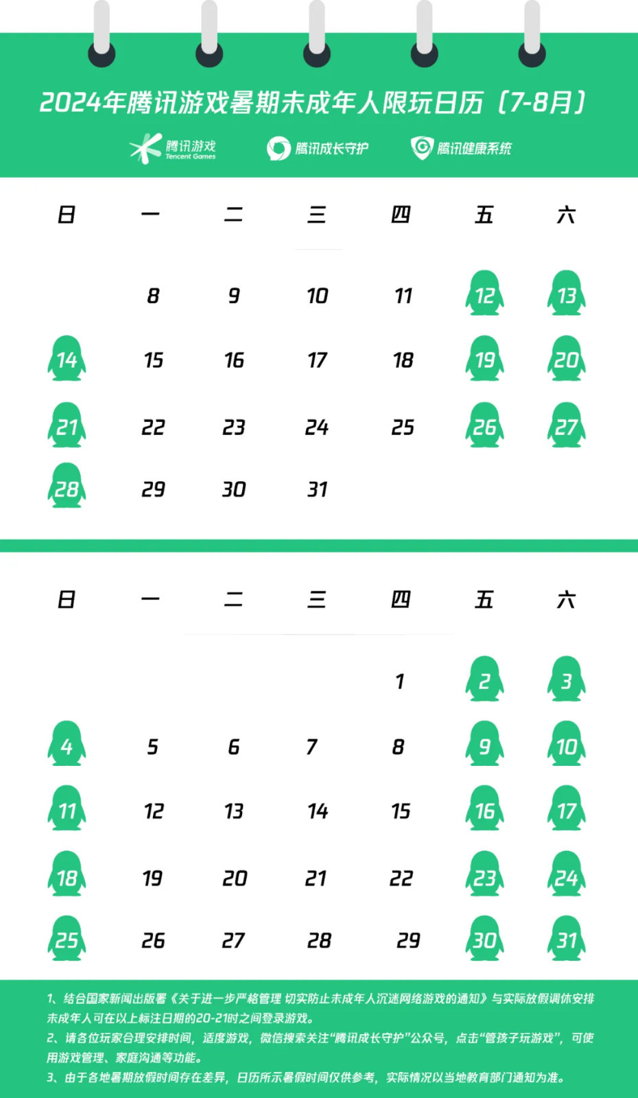 今日(6月26日),腾讯游戏公布2024年暑期未成年人限玩日历,据悉,未成年人暑期游戏时段为每周五六日晚上20-21点,游戏时长总计23小时。