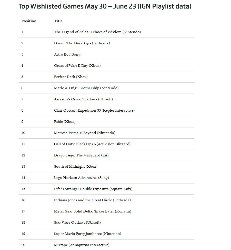 此外紧随其后的是贝塞斯达公布的《毁灭战士:黑暗时代》,排到第三位的是索尼最新的《宇宙机器人》(在任天堂直面会之前本作是愿望单第一名),而《战争机器:事变日》则排在第四名,第五名为微软重启的《完美黑暗》。