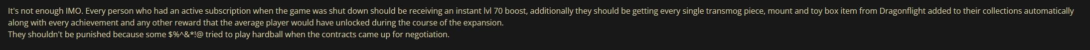 "笑死,这点奖励根本不够,每个在游戏停服时拥有有效订阅的人都应该立即获得 70 级直升,此外,他们应该将巨龙时代中的每一个幻化、坐骑和玩具自动添加到他们的收藏中,以及每个成就和普通玩家在游玩过程中解锁的任何其他奖励。他们不应该因为合同谈判时有傻X想赚钱而受到惩罚,"