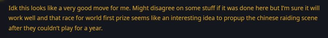 "我觉得这对我来说是个好消息,如果这件事发生在这儿,我可能不太赞同其中一些东西,不过我确信,在他们一年没玩到魔兽世界的情况下,首杀争夺战肯定能有效让中国的团本队伍振作起来。"