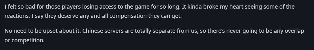 "我为那些长时间玩不了魔兽世界的玩家而感到难过,看到他们的反应我真的有点心碎,我觉得他们值得得到任何奖励。没必要觉得不公平,中国服务器和我们是分开的,其中不存在任何竞争关系。"