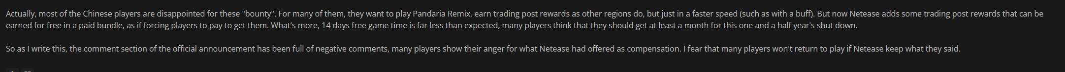 "实际上,大多数中国玩家对这些“奖励”感到失望。对于他们中的许多人来说,他们想玩熊猫人幻境新生,像其他地区一样获得商栈奖励,但只是速度更快(例如有增益)。但现在网易增加了一些商栈奖励,可以在付费捆绑包中免费获得,就好像强迫玩家付费才能获得它们一样。更何况,14天的免费游戏时间远低于预期,很多玩家认为,这一年半的停服时间,至少应该得到一个月的时间。所以在我写这篇文章的时候,官方公告的评论区已经充斥着负面评论,很多玩家都对网易提供的补偿表示愤怒。如果网易遵守他们的说法,恐怕很多玩家不会回去玩。"