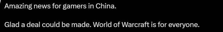 "对中国玩家来说真是个好消息,很高兴这笔交易最终成交了,大家都有魔兽世界玩。"