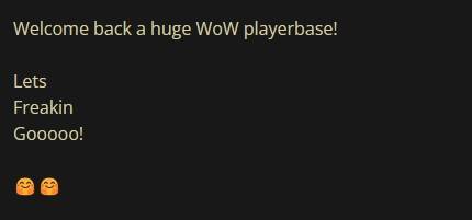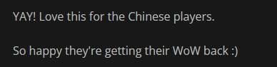 "芜湖,对中国玩家来说太好了,真开心他们能重新玩到魔兽世界:)"