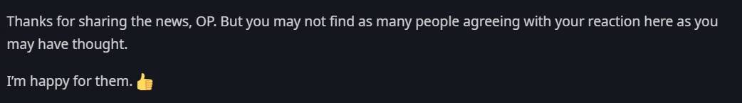 "谢谢你的新闻,楼主,不过应该没人赞同你,我为那些玩家感到高兴。"