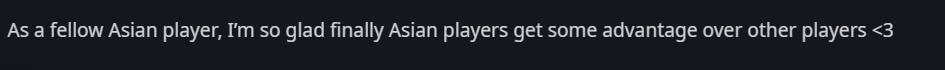 "作为一名亚洲玩家,我真高兴亚洲玩家终于有点优势了(比心)"