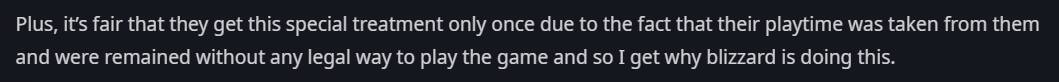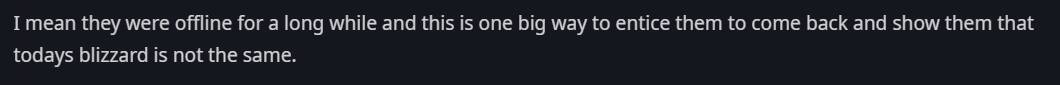 "我意思是,他们很久没玩了,这是吸引他们回来并向他们展示现在的暴雪已经不一样了的一种方式,另外,他们只得到一次这种特殊待遇是公平的,因为他们的游戏时间被剥夺了,而且没有任何方式来玩魔兽世界,所以我明白暴雪为什么要这样做。"