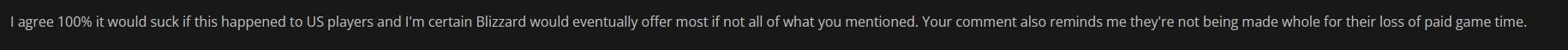"我百分之百同意楼上的,如果这件事发生在美服玩家身上,暴雪肯定会把你说的全给玩家,你的评论也提醒我,他们因为损失了游戏时间,所以做不了全收藏了。"