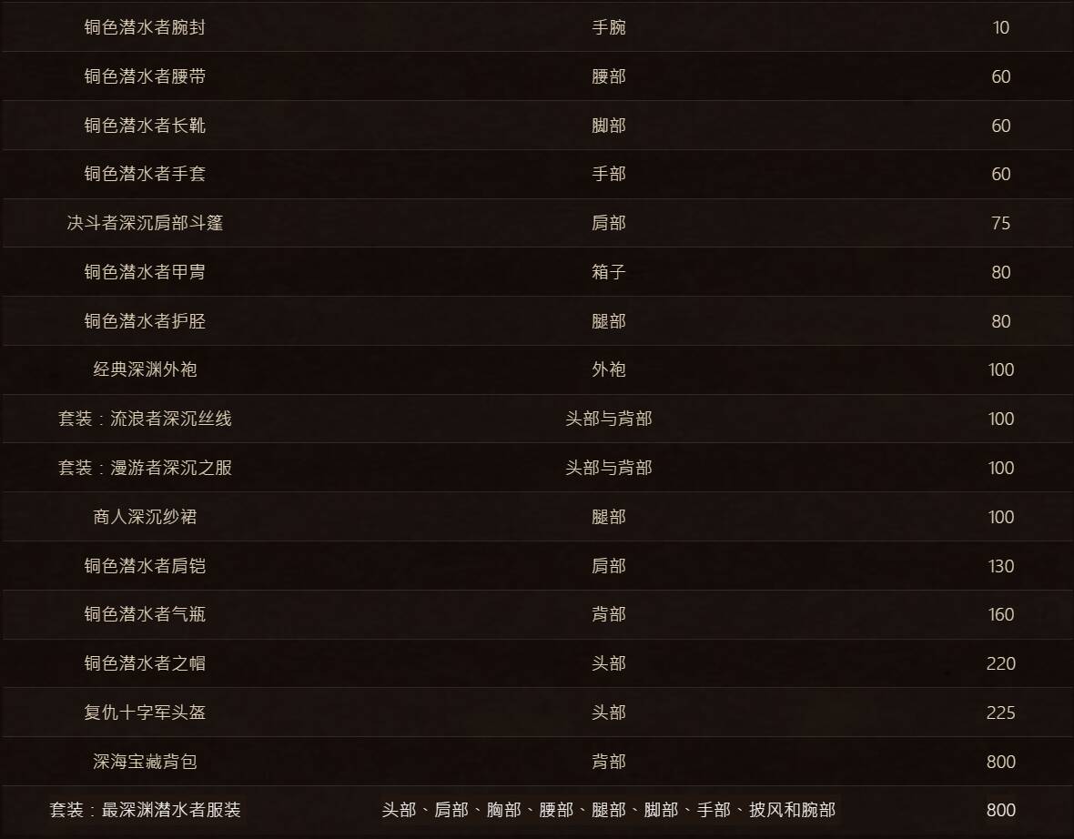 套装:深渊潜水者服装 头部、肩部、胸部、腰部、腿部、脚部、手部、披风和腕部 800