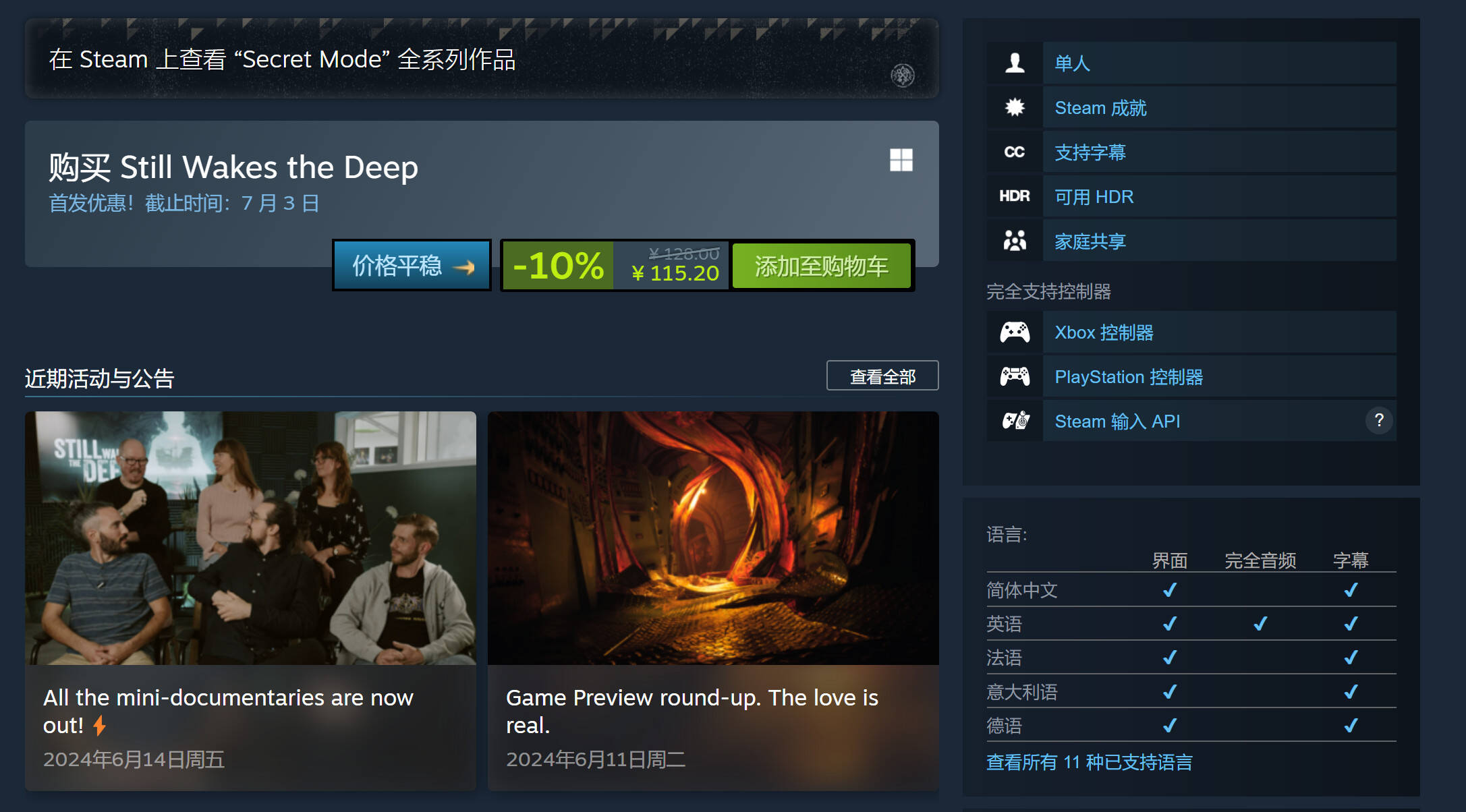 虚幻5恐怖游戏《仍然唤醒深海(Still Wakes the Deep)》近期(6.18)发售,Steam国区128元,当前发售特惠-10%,售价115.2元,支持简体中文。