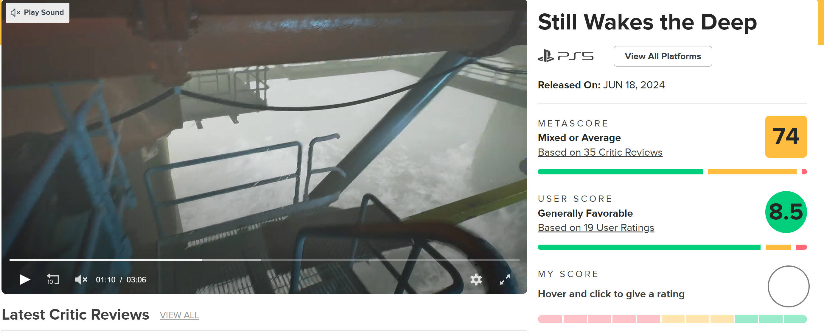 Steam用户称赞“《仍然唤醒深海(Still Wakes the Deep)》对环境和细节的刻画非常有沉浸感,摇摇欲坠的钻井平台无时不刻令人绷紧神经。游戏的整体流程在3个半小时左右,虽然并不长,但整体的体验是令人印象深刻的。”