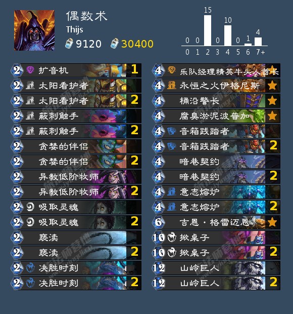 至于必带的牌,经理马林目前看来可以灵活地出现在各种中慢速卡组里;而对于奇偶的选择问题,带真正偶数术的5位分别是太子、Babybear、其哥、唐三十六和夏布去,唯一带奇数战的则是陌路烟明,而其他10人把吉恩这张“狼王食人魔”带进了污手骑、自残术甚至发掘贼等各种主流卡组里。