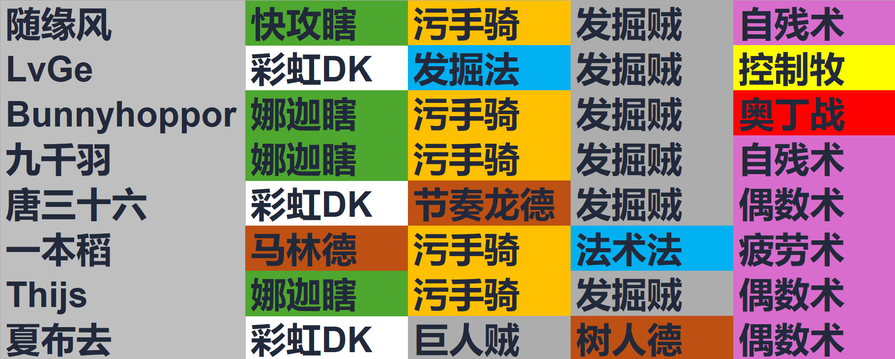 这次赛前我们在邀请主播时就特意选了好几位构筑鬼才,比如之前频频引领战队联赛潮流的Bunnyhopper,比如专精猎人的其哥、再比如Babybear和她男朋友Jambre的“Jambear”组合在欧洲各种社区比赛里也经常放大招,等等。而他们也真的不负众望,像Babybear的挖掘萨合剽刀贼两套都属于秘密武器,其哥也果然是唯一老猎人,Bunnyhopper的奥丁战也是独一份(还选择了MC布林顿作为一种新的软)。还有陌路烟明,他最为人熟知的标签是天梯各种登顶,但他在卡组构筑上也已经是硕果累累,这次他就是唯一的奇数战。