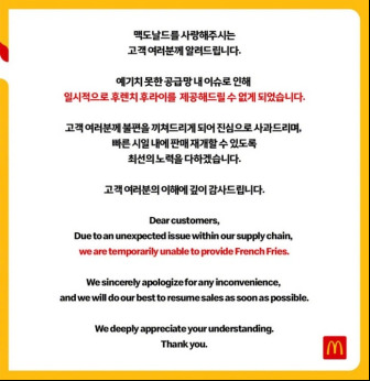 韩国麦当劳表示,由于意想不到的供应链内的热点问题,导致我们暂时无法提供炸薯条,给各位顾客带来不便深感抱歉,我们将尽最大努力尽快恢复销售。