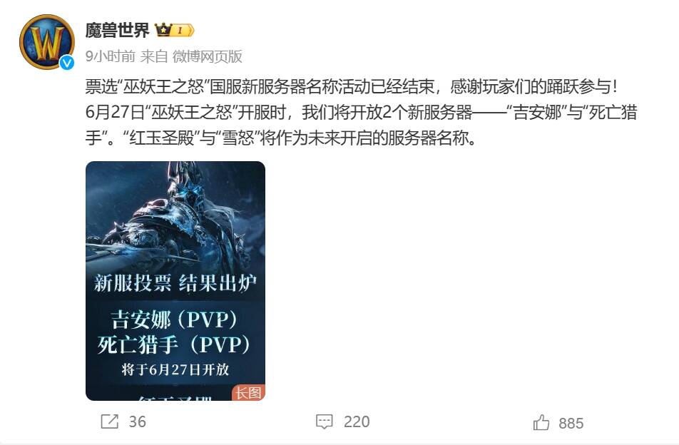 《魔兽世界》官方发布微博宣布,“巫妖王之怒”的新服务器名称投票已结束,6月27日“巫妖王之怒”开服时,将率先开放“吉安娜”与“死亡猎手”。“红玉圣殿”与“雪怒”将作为未来开启的服务器名称。