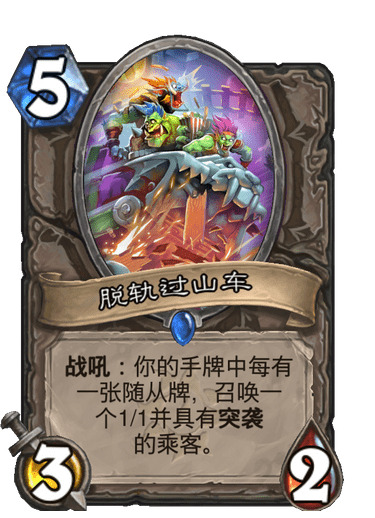 - 3、脱轨过山车:脱轨过山车是任务贼中期开始超展开的资本,5费就能打出一地5-5突袭,解场的同时还能返场叫杀,通过反复回手多次利用,能进行持续性压制,只要对面解不干净下回合随时进入斩杀范围。前期做任务亏掉的节奏用这张卡就能一回合瞬间打回来。过山车在手就要考虑适当保持手牌随从数量,用来打出更多的衍生物,碰到即使打出满场6个5-5都解不干净对面场的情况,或者手牌资源不多的情况下,可以考虑打出战略转移,本体连带衍生物全部收回来也不亏,衍生物本身也是1费5-5突袭极其超模,利用多余的费用再打出1-2个进行补刀或者站场。