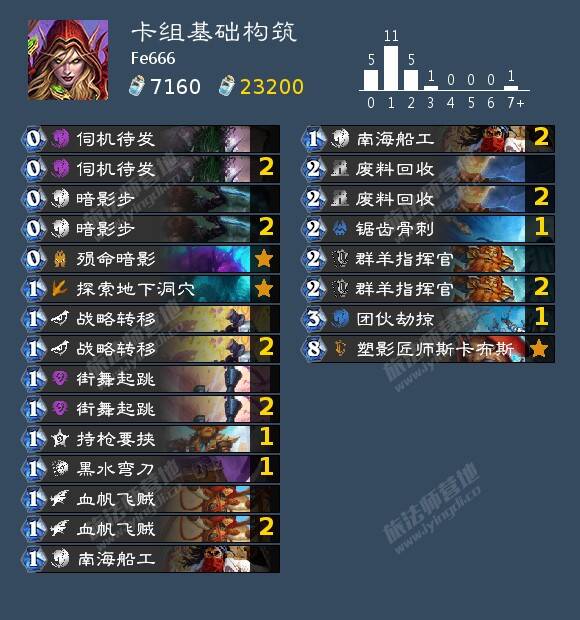 - 起手留牌:优先级:做任务牌>小解牌>过牌>高费卡手牌,不管先后手优先考虑留伺机待发,先手不留殒命暗影后手可留增加天湖概率。做任务素材优先级: 废料回收>血帆海盗>群羊指挥官,回手牌优先级:暗影步>战略转移>街舞起跳,任务素材和回手牌,保留优先级高的,优先级低的可以直接换走,比如同时有废料回收+血帆海盗,那么血帆海盗就可以换掉了,使用战略转移做任务,最佳方式依次打出:两个衍生物+战略转移+两个衍生物,能节省费用。