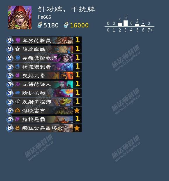 面对otk自闭卡组可采取脏鼠,换手等反击手段,喜欢干扰可带大小塞布持枪恶霸,个人更喜欢带秘迹观测者3费5-5挂2个随机奥秘非常超模还能扰乱对手,以上牌搭配回手多次利用效果更佳,针对特定卡组可以带上陷坑蜘蛛(点燃法,傀儡大师换家德),反射工程师(蛋猎,雷批), 以上牌需要根据所在分段环境选择性投入1-2张,打不过我们就带针对牌,好卡组是应该适应环境去进行调整的,而不是一味抱怨环境。