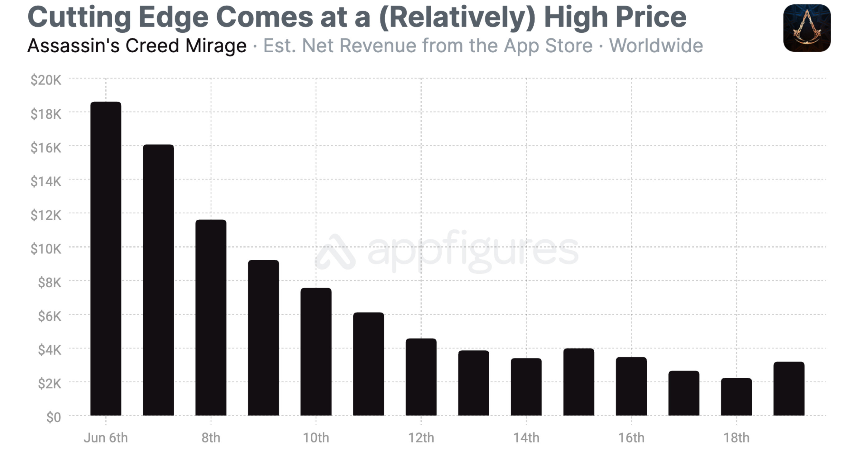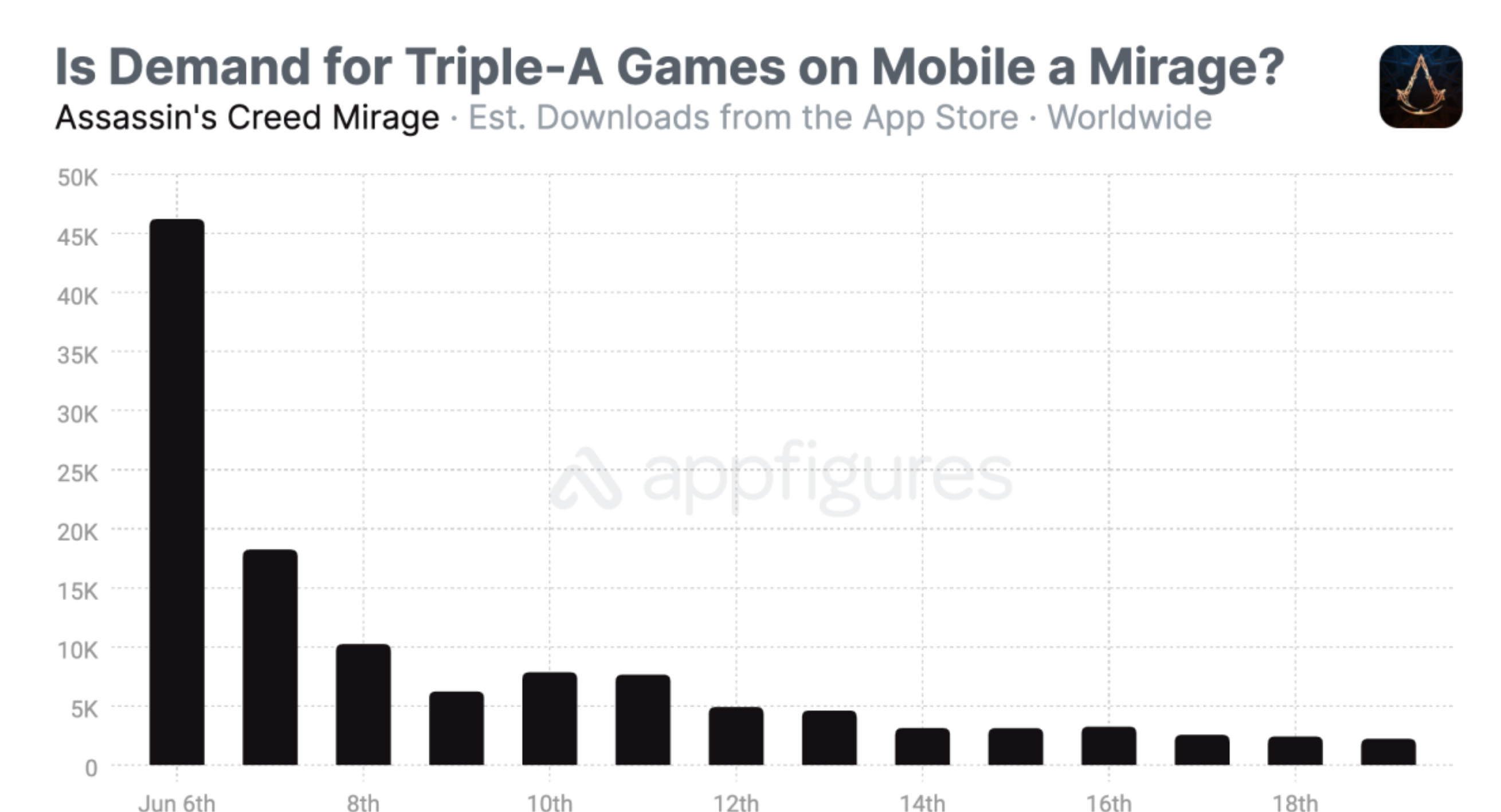 根据Appfigures的估计,自6月6日推出以来,愿意以49.99美元全价购买《刺客信条:幻景》的人不到3000人。Appfigures表示,这款游戏的下载量约为12.3万次,迄今为止总收入仅为13.8万美元。这款游戏只能在iPhone 15 Pro、iPhone 15 Pro Max和高端iPad上玩。